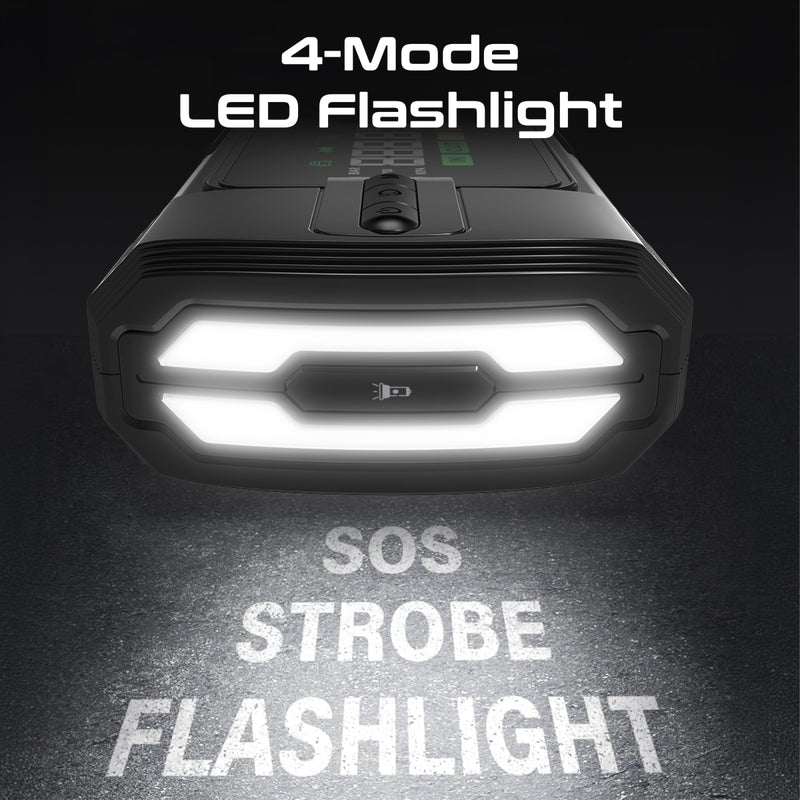 Introducing the PatrolPack-3 by Promate, the ultimate solution for all your roadside emergencies. This rugged 4-in-1 jump starter is packed with features to keep you and your vehicle prepared on the go. With a peak current of 1200A/12V, it can jump-start your vehicle effortlessly, while reverse polarity protection ensures safe operation every time. Need to inflate your tires? No problem. The built-in 150PSI air compressor has got you covered. Plus, with a massive 12000mAh battery capacity, you can power up your mobile devices multiple times over. Stay informed with the automatic TPMS (Tire Pressure Monitoring System) function and the big LED screen displaying crucial information. With dual USB-A ports, including one with QC 3.0, and a 160W DC output, you can charge your devices at lightning speed. Don't forget the 4-mode LED flashlight for added convenience. Get ready to hit the road with confidence with the PatrolPack-3.