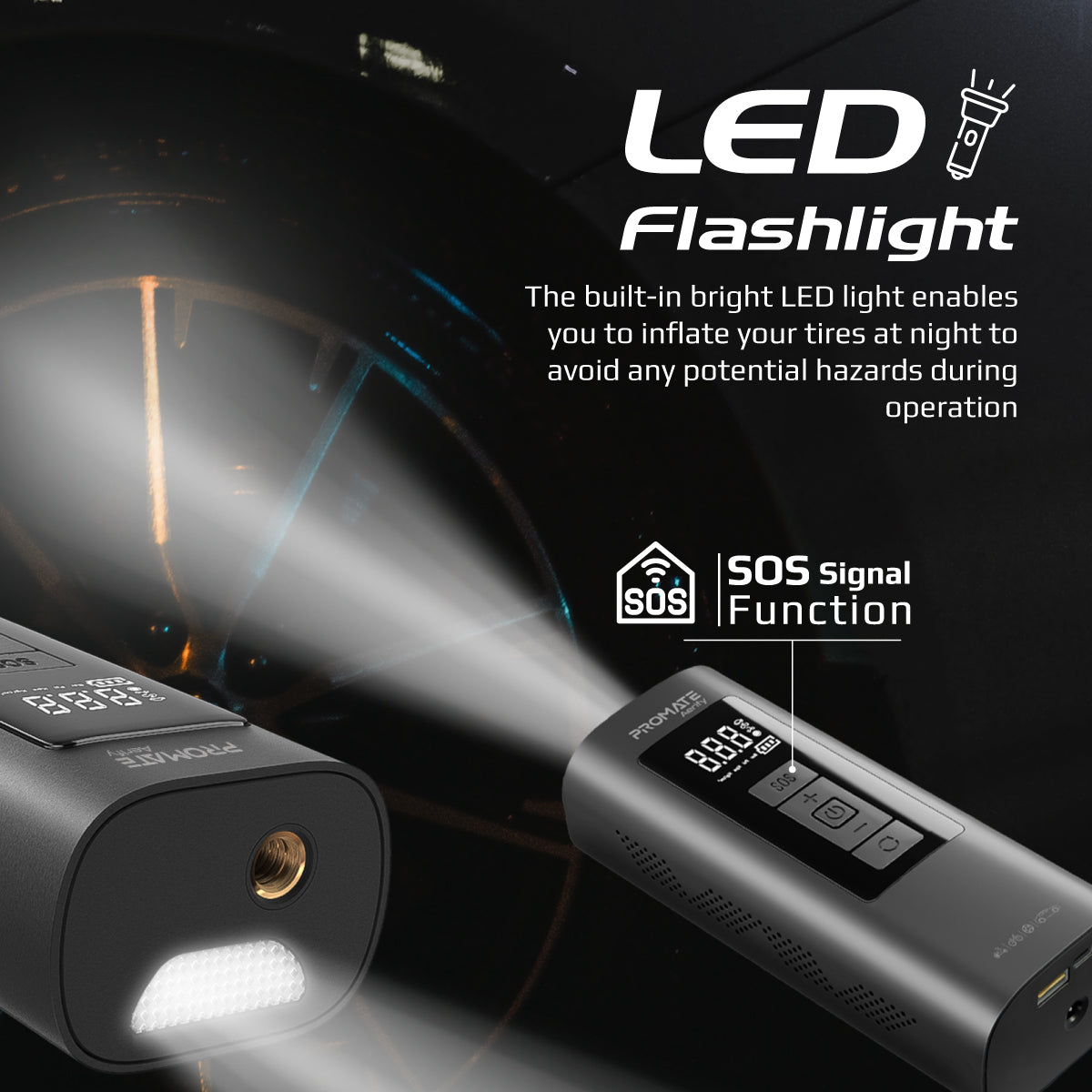Get ready for all your adventures with Aerify. With an airflow output of 25L/min, you can inflate a car tire fully in just 7 minutes. The integrated USB port and 6000mAh battery allow you to charge any smartphone device. The built-in bright LED light ensures safe tire inflation at night, preventing potential hazards during use.