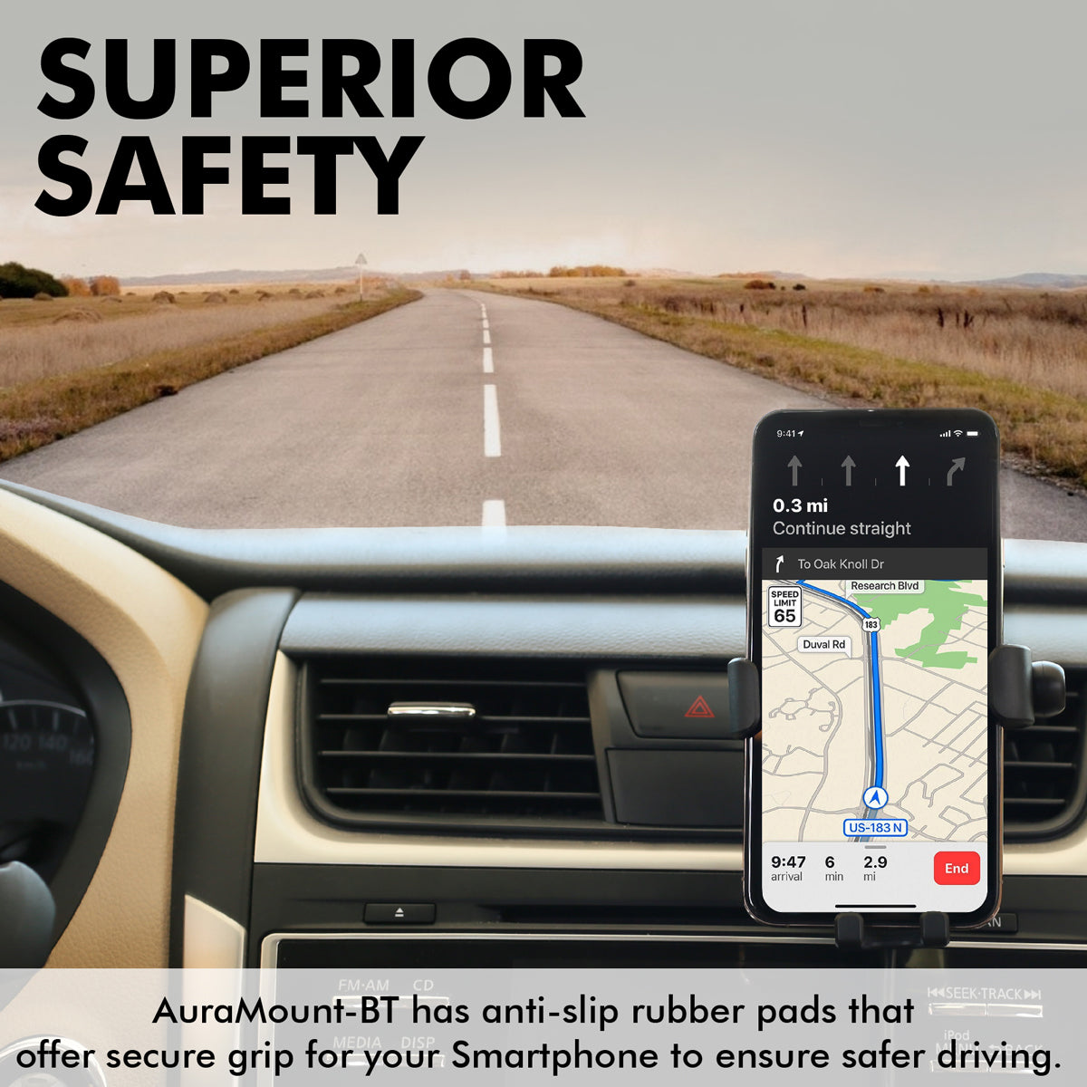 The AuraMount-BT merges Qi wireless fast charging with a convenient one-touch mounting system and wireless hands-free function. Simply place your smartphone in the cradle for automatic clamping and charging. Stay connected on the go with the mono hands-free earphone. It's the ultimate all-in-one road accessory.