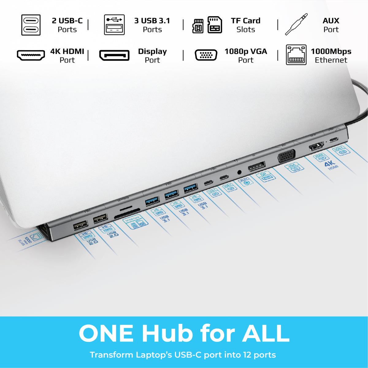 Easily connect your laptop or USB-C device using the BaseLink-Pro. This USB-C hub offers multiple ports including USB-C 3.1, ethernet, 4K HDMI, Display Port, USB 3.0, USB 2.0, SD/MicroSD card slots, and an AUX port. With Power Delivery support for an 87W charge, the BaseLink-Pro is your ultimate peripheral partner.