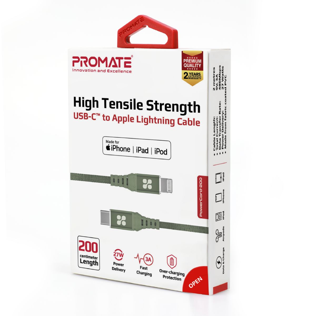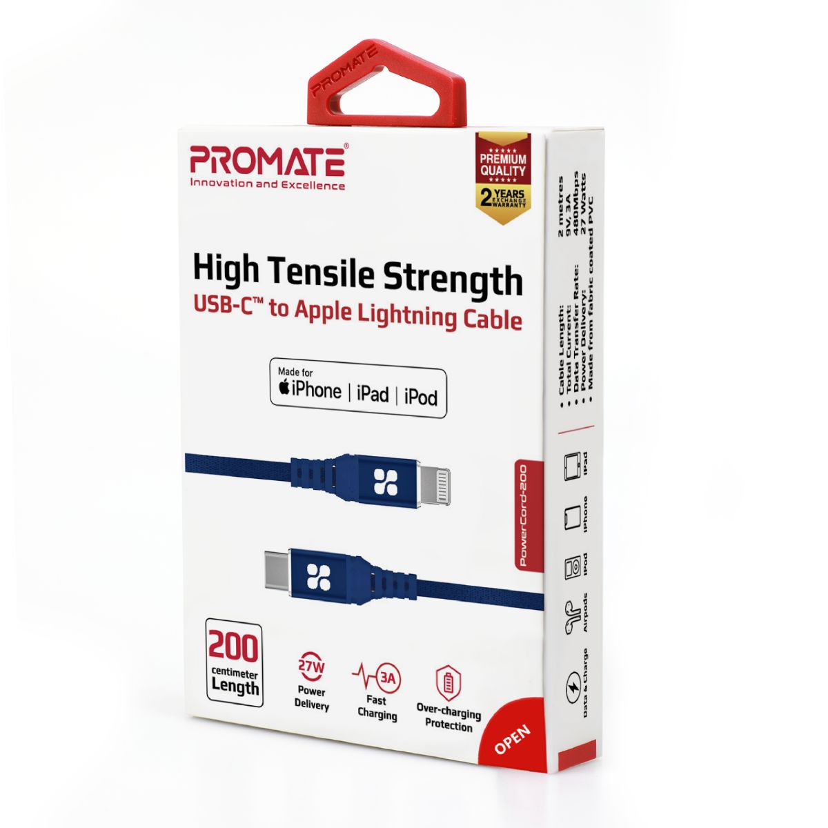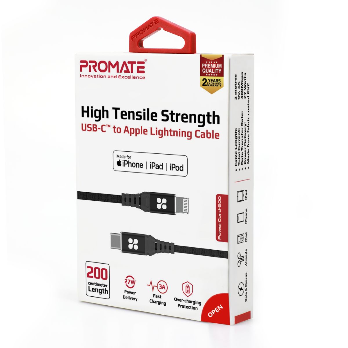 PowerCord-200 enables you to charge and sync data at accelerated rates. With support for 60W Power Delivery, it caters to all your USB-C fast charging requirements. The C94 Lightning connector ensures 2.5x faster charging for your Apple devices. Boasting a sturdy 2m braided nylon exterior, the cable guarantees durability. Additionally, it is Apple MFi certified, ensuring exceptional safety against overcharging and short circuits, while its robust construction and reinforced stress points contribute to a long lifespan.