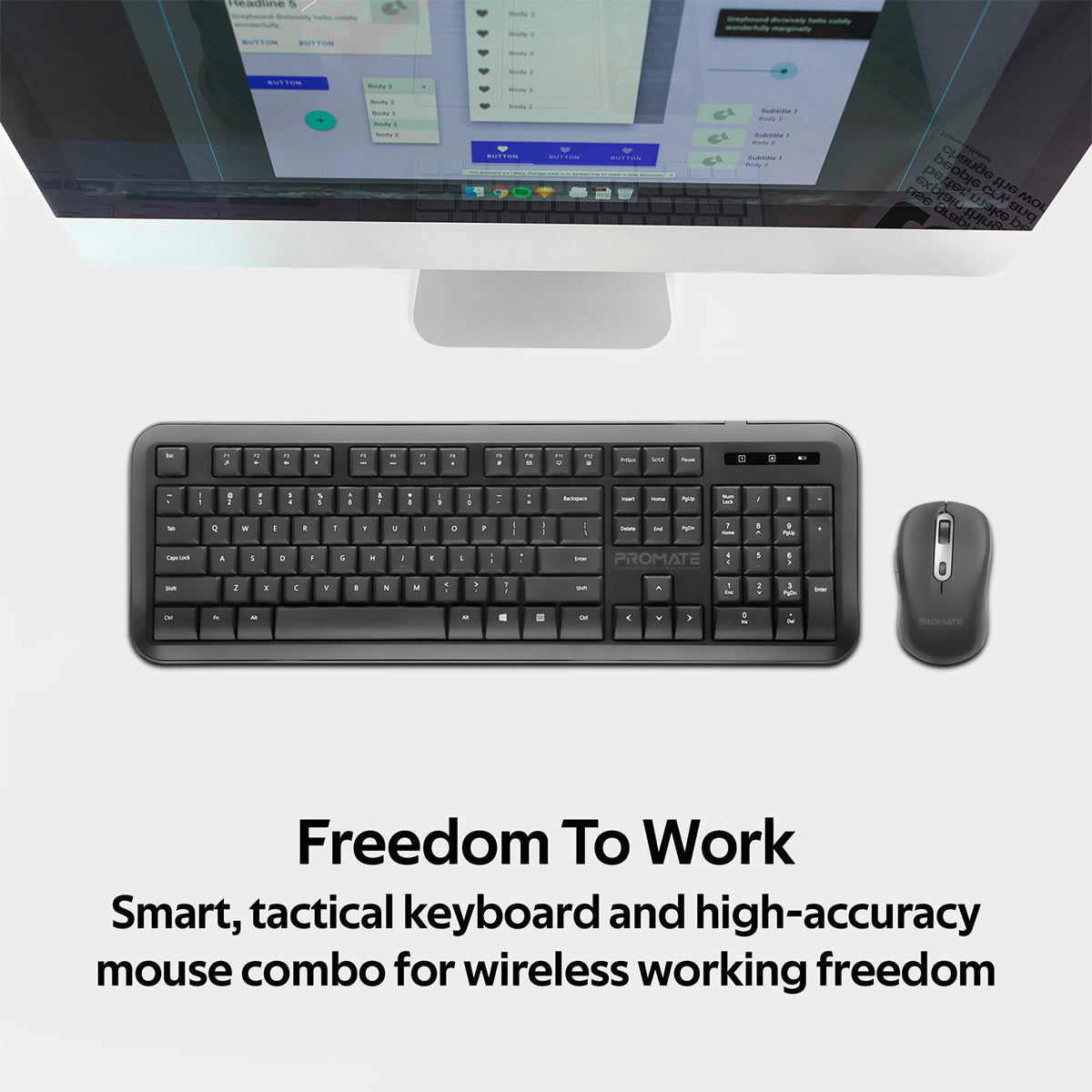 Experience the ultimate wireless keyboard and mouse combo with ProCombo-6. Enjoy precise wireless mouse control with adjustable DPI up to 1600 and a comfortable soft-touch keyboard for unrestricted work flexibility. The 2.4 GHz wireless connectivity with a 2-in-1 USB-A/USB-C dongle adds convenience. The ergonomic design ensures comfort even during extended use, while the auto-sleep function conserves battery life when the mouse or keyboard are idle.