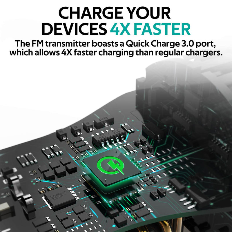 Experience smart driving with this multi-function car kit with FM transmitter. Simply plug the SmarTune-2+ into your car cigarette lighter socket, and you are ready to go. With built-in microphone, the FM transmitter provides the hands-free function to answer/reject calls. SmarTune-2+ features QC3.0 quick charging port and another USB charging port which also functions as a U disk port for playing music. With multiple connectivity options, including USB flash drive, microSD Card, and Bluetooth, SmarTune-2+ is your exceptional car companion.