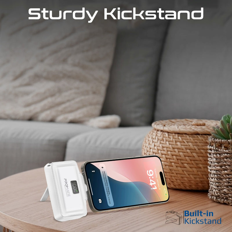 Introducing PowerUp-10Duo, a revolution in portable power and another first-to-market product from Promate, with an unprecedented capacity-to-size ratio. This sleek, mini power bank packs serious energy thanks to a powerful 10,000 mAh battery, which provides double the power versus other mini power banks available in the market. With built-in foldable 20W USB-C™ and Lightning connectors, plus an additional 20W USB-C™ in/out port, it effortlessly charges multiple devices at lightning-fast speeds. The LED battery display keeps you informed, while advanced overcharging and overheating protection ensure safety with every charge. Designed for life on the go, the PowerUp-10Duo fits seamlessly into your pocket or bag and even features a convenient integrated kickstand, making it the perfect travel companion. Stay charged, stay ready, and stay ahead with Promate.